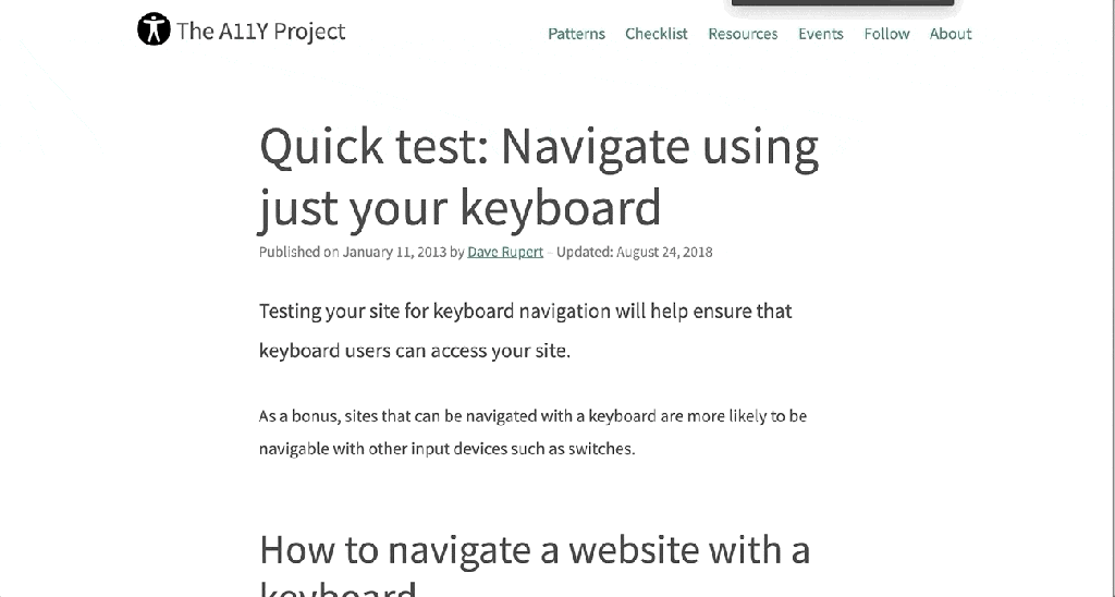 - Can you navigate/use it with a keyboard? The focus indicator should always be visible. A Skip to Content link is a bonus.